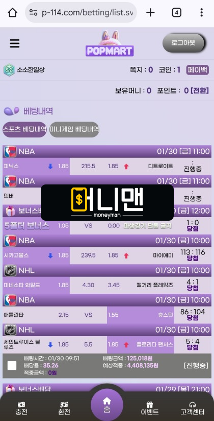 먹튀 하기로 작정한 팝마트 신고합니다. 예전에는 규정 위반을 핑계 대며 몰수 처리하더니 이번에는 그냥 아무 말도 없이 440만원을 도둑질했습니다. 몇 달 동안 하루에 수십만원씩 충전하며 스포츠배팅을 꾸준하게 해왔고 가입 초반에는 거의 낙첨만 시키다가 최근 들어 운때가 잘 맞는지 적중이 몇 번 나오면서 차근차근 잃었던 본전을 복구하고 있었습니다. 그러다 저번에 스포츠배팅 4폴더를 적중시켜 500만원을 만들었는데요. 규정 위반이라는 이유로 원금만 남겨 놓고 전부 몰수 처리해 가더군요. 많이 억울하긴 했지만 저도 규정을 제대로 숙지하지 못한 부분이 있었다고 생각해서 제 잘못을 인정하고 다시 배팅을 이어갔습니다. 그런데 흐름이 끊긴 건지 이후로는 또 낙첨만 계속 나오기 시작하더라고요. 그러다가 이번에 다행히 미국 농구와 하키 조합으로 걸었던 6폴더가 적중되면서 12만원으로 무려 440만원을 만들게 됐습니다. 이번에는 규정을 어긴 것도 없었고 신경 써서 배팅한 내역이라 문제없이 환전해 줄 거라고 생각했는데요. 사이트에 접속하려고 보니까 로그인이 안 됩니다. 처음에는 일시적인 오류인가 싶어서 다른 핸드폰과 PC로도 접속해 봤지만 결과는 똑같더라고요. 한동안은 현실을 부정하려 애를 써봤지만 이제는 제가 먹튀 당했다는 사실을 인정할 수밖에 없게 됐습니다. 팝마트 홍보 글도 유독 많이 올라오고 조작이 의심되는 토토후기도 자주 보이던데 저처럼 되고 싶지 않다면 절대 낚여주지 마세요.
