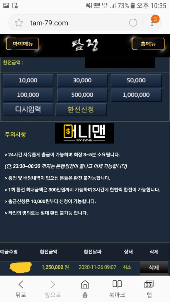 99벳에서 탐정으로 리뉴얼됬던 사이트인데 125만원 환전신청 하니까 바로 쪽지가 왔습니다.