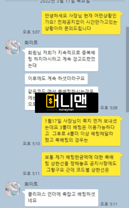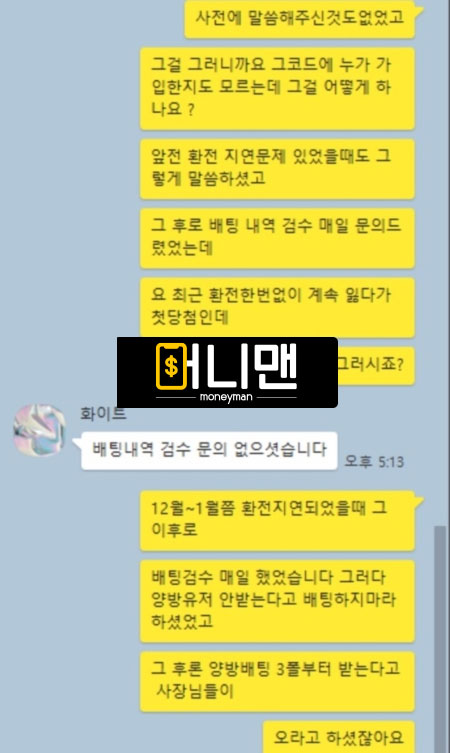 안녕하세요 화이트벳 이용하다가 먹튀를 당하게 되어서 이렇게 제보를 드립니다. 저는 평소에 스포츠 4폴더 고액으로 좀 즐기는 유저인데 이번에 65만원 가량으로 스포츠 4폴더(축구, 느바 조합)으로 배팅을 햇었고 당첨된 금액이 680만원 이였습니다. 여기 사이트가 상한이 높아서 다른 사이트에 쪼개서 베팅하지도 않았고 정상적인 실벳인데 돈이 없는지 출금을 요청하니까 배팅을 하고 검수 요청하고 다 승인을 받아놓고 출금하려 하니까 배팅에 문제가 있다고 하면서 축 배팅은 하지 말라고 했었다고 하네요. 그런 소리 들은 적도 없었는데. 아무튼 당첨금 전부다 먹튀하고 카톡 답장도 없는 새기들입니다. 절대 이용하지 마세요