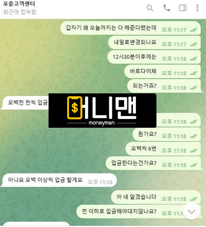 포츈카지노 여기 심각한 구멍가게입니다. 기존에 환전이 2천만원까지는 잘 나와서 여기 안전한 곳이구나 생각하고 열심히 이용했습니다. 그리고 3월 19일에 총 2000만원 출발로 5000만원 마감 치고 환전 누르니까 지금 2000만원은 바로 환전 처리가 가능하지만, 나머지 3000만원에 대해서는 은행 점검 시간이 지나서 500만원 씩 나누어서 6번 입금을 해준다고 했습니다. 근데 상위 총판한테 들어보니 포츈카지노 본사 측에서 시재가 부족하다면서 제 돈을 누르면 홍보비 차원으로 300만원을 지급해준다는 내용을 듣게 되고 너무 어이가 없어서 텔레로 따졌지만 그냥 아이디 삭제 처리하고 대화 삭제하고 도망가네요 ㅋㅋ