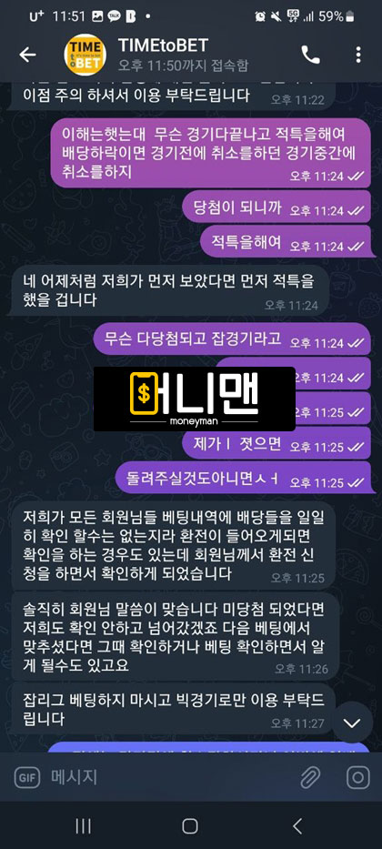 안녕하세요 타임투벳에 4월 7일 날 가입하고 2일 정도 사용했습니다. 한번 당첨돼서 환전 버튼 누르자마자 전액이 사라졌습니다. 환전 상태도 대기 중이었고요. 그래서 좀 기다리다가 고객센터에 문의 글을 남겼습니다. 사이트에서는 경기에 확인할게 좀 있으니 기다려달라 하여 좀 기다렸습니다. 한 20분쯤 지났나 당첨금은 다 사라지고 원금인 33만원 만 보유금액으로 복구해 주길래 얼탱이가 없어서 문의하니 무슨 말도 안 되는 배당 하락 프로그램을 쓴다고 잡경기 말고 빅경기로만 배팅을 하라는 겁니다. 그럴 거면 잡경기를 올리지를 말던가 아무런 규정도 없고 무슨 잡경기좀 걸었다고 당첨금을 몰수해가는 사이트가 어딨나요 ㅡㅡ 경기 시작 전에 배팅 취소한 것도 아니고 경기 끝나고 당첨되니깐 그제야 말도 안 되는 소리만 계속하면서 당첨금 다 몰수 당했습니다. 타임투벳 절대 이용하지 마세요 환전 나갈 돈 하나도 없는 악질 먹튀사이트 입니다.