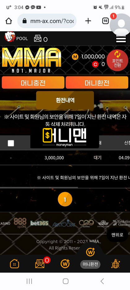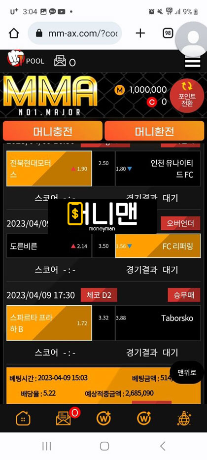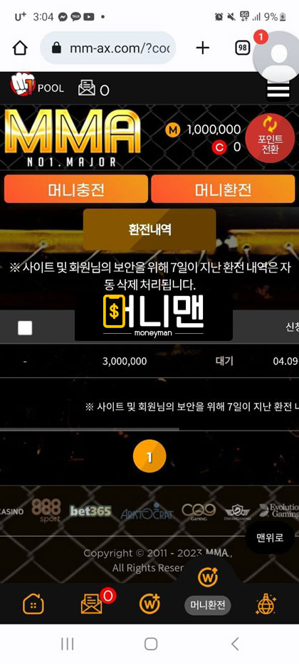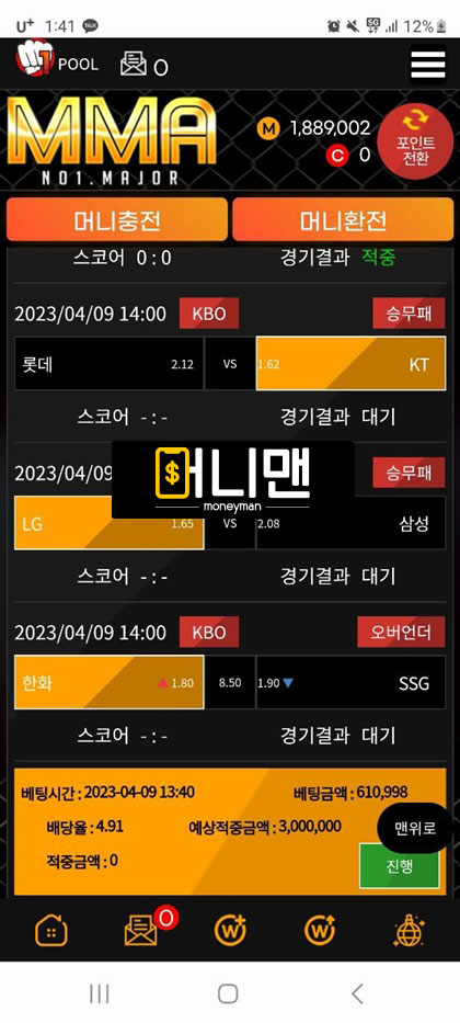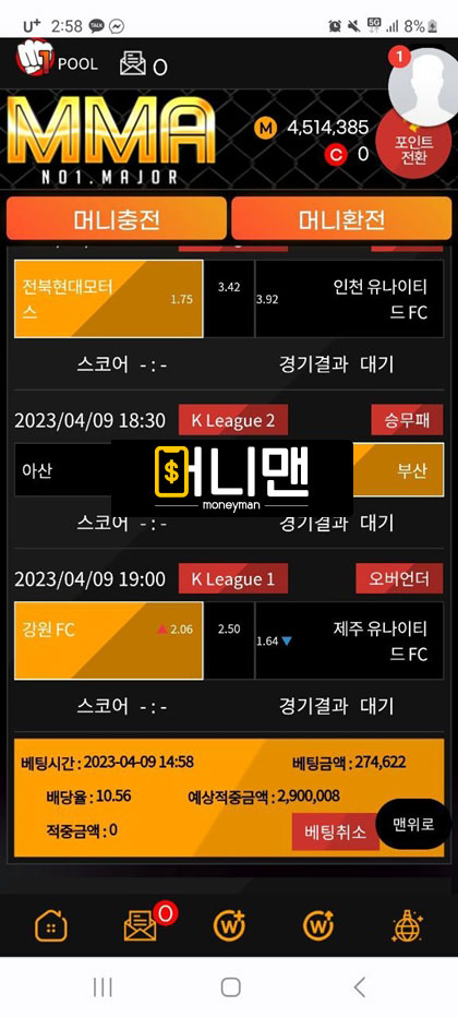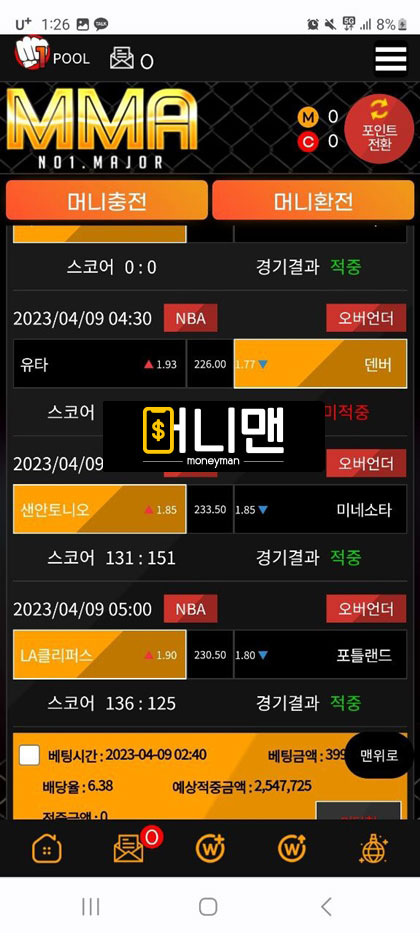 mma사이트 이용하다가 양방 의심받고 당첨금 다 몰수당했습니다. 4월 9일경 토지니라는 커뮤니티 제휴업체를 보고 가입했습니다. 첫 충 100만원해서 첫 이용 포인트 40만원 받아서 총 140만원 보유 금액이 있었습니다. 스포츠 배팅을 했습니다. 배팅한 게 적중이 되었고 총금액이 400만원 정도 있었습니다. 환전 신청을 하니 양방의심이 된다고 카드 내역을 보여달라고 하길래 원하는 정보 다 보여줬습니다. 4일 전에 여기 이용하기 전에 다른 곳에서 배팅했던 충전내역을 보면서 양빵이라고 몰아가서 원금만 돌려주고 현재까지 어떠한 메시지도 보고 있지 않습니다. 토토핫이라는 곳에도 보증업체로 올라와 있어서 연락 후 먹튀 당한 거 인증하니 토지니 측에 연락해서 보상받으라고 해서 토지니에 연락했지만 지금까지 연락을 피하는 상황입니다. mma에서도 연락을 피하고 있고요. mma 최근에 여기저기 배너 많이 달고 홍보 많이 하는거 같은데 이 금액을 왜 먹튀를 하십니까 mma 관리자님 혹시라도 이글 보면 꼭 연락하세요.