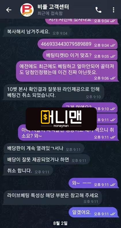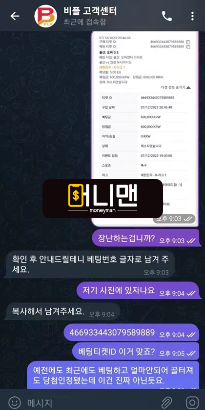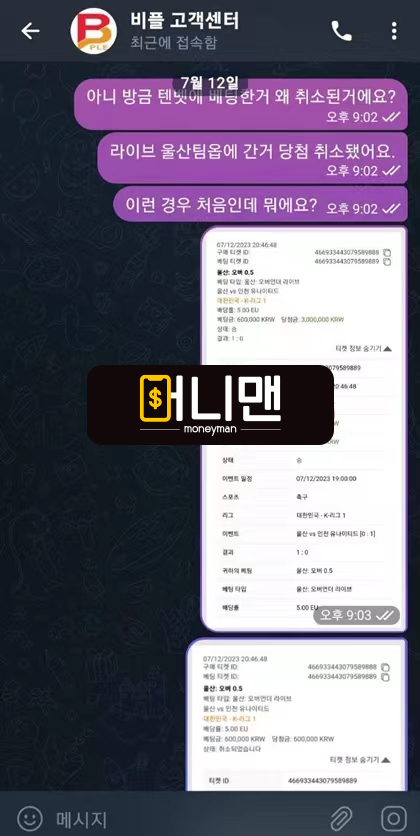 비플에서 먹튀 당했습니다. 사용하면서 문제가 없던 곳인데 이번엔 다르네요. 울산 0.5 팀오버에 실시간 라이브 배팅을 했습니다. 배팅 후 약 1분 후에 울산 현대의 골이 터지고 당첨 처리가 됐습니다. 그런데 갑자기 10분 후쯤 당첨 취소를 하는 겁니다. 어이가 없어서 고객센터에 이야기하니까 계속 이상한 이야기만 늘어놓습니다. 본사 확인 결과 잘못된 라인 제공으로 인해 취소되었다고 하네요? 제가 잃었다면 이런 짓을 했을까요? 배당판이 계속 열려 있거나 배당이 잘못 제공되면 취소한다고요? 자기들 마음대로? 뭐 이리 주먹구구식으로 운영하나요. 백번 양보해서 해외 본사에서 장난질했거니 생각하고 그냥 넘어가려고 했습니다. 하지만 거길 쓰던 지인한테 이야기 듣고 화가 나서 올립니다. 거긴 오래된 해외 사이트였고 메이저급이라고 하네요. 그리고 배당판만 받고 해외 본사 드립치면서 적중금 먹튀 하는 곳이라고 합니다. 그냥 작정하고 먹튀하는 곳이라고 하네요. 제가 돈 잃을 때는 가만히 있다가 제가 돈 딸 때는 본사 핑계 대면서 먹튀하는 악질 업체입니다. 7월에 사건 터지고 비플이랑 다투다가 이제야 먹튀 확정되어서 신고합니다. 너무 힘든 시간이었습니다. 이렇게 해놓고 메이저라고 홍보하는 게 더 열받네요.