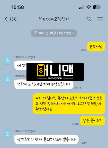 안녕하세요. 사장님 모로코에서 3,000만원이라는 꽤 큰 돈을 전부 먹튀 당했습니다. 처음 총판을 통해서 다른 사이트에 가입했고 소소하게 이용하던 중 이번에 저를 유심히 봤는데 카지노 배팅하는 게 상위 사이트랑 더 맞을 것 같다며, 레벨 최고로 맞춰 줄 테니 모로코를 메인 사이트로 이용해달라고 하여 가입 후 이용하였습니다. 처음엔 환전도 잘 나오고 최고 1회 환전 2,700만원까지 받아봐서 믿고 이용하던 중, 어제 새벽 카지노로 3,500만원 정도 잃었고 추가 충전 후 3,000만원까지 복구하여 환전 신청하니 갑자기 사이트 튕기고 아이디 삭제를 당했습니다. 총판 카카오톡 문의는 답장도 없고 모로코 고객센터 역시 로그인 안 되자 카톡 문의하였지만, 한 마디 안내도 없고요. 사이트 로그인 창 아래 있던 텔레그램, 카카오톡 고객센터 아이디 안 보이게 삭제했으며, 처음 이용했던 사이트 역시 아이디가 막혔습니다. 해당 사이트의 고객센터 문의하니 로그인 안 되는 이유는 답변 안 하고 상위총판한테 문의하라고만 하며, 이후 대답이 없습니다. 분명 기존 사이트와 총판 그리고 모로코 전부 한통속인 듯합니다. 현재 연관된 모든 곳에 제가 문의할 수 있는 채널은 단 한 곳도 없이 전부 차단당하고, 전액 먹튀 당했네요. 혹시라도 여기 사용하시는 분들이 계신다면 당장 이용 중지입니다. 절대 환전 안 나옵니다.