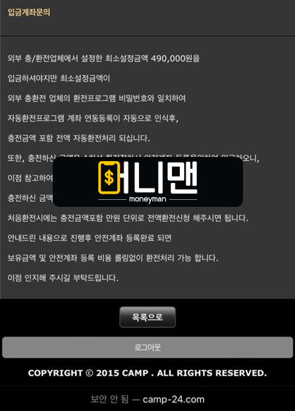 캠프 추가 입금 유도하더니 49만원 먹튀 하네요. 예전에 이 수법으로 피해 본 사람들이 있다고 들어서 익히 알고 있었는데 막상 저에게도 이런 일이 발생하니까 뭔가에 홀린 것처럼 돈을 입금하고 있던 제 모습에 어이가 없어서 웃음이 납니다. 진짜 저는 이런 허접한 먹튀를 당할 사람이 아닌데 워낙 순식간에 일어난 일이라서 올바른 생각이나 의심할 겨를이 없었습니다. 이렇게 피해를 보고나니까 더욱이 먹튀검증에 만전을 기해야겠다는 마음이 커집니다. 여러분도 항상 조심하시길 바랍니다. 이런 일은 누구에게나 일어날 수 있는 것 같아요. 문자 메시지로 사이트가 이사했다면서 먼저 연락이 옵니다. 남아있는 금액이 있으니 사용하라고 하는데요. 제가 사용하는 아이디와 비번을 입력하니까 실제로 로그인이 됩니다. 그래서 더욱 의심을 못 했던 것 같아요. 남아있는 돈으로 배팅 후 143만원 환전 신청했는데요. 증거 사진을 보시면 아시겠지만 49만원을 추가로 입금해야 환전이 된다고 해서 입금했다가 그대로 먹튀 당했습니다. 이 수법을 늘 기억하시고 추가 입금 유도하는 업체는 무조건 피하시길 바랍니다. 일단 피해 금액이 49만원으로 적어 보이긴 하지만, 피해자가 많아질수록 총 피해 금액은 늘어날 것입니다.