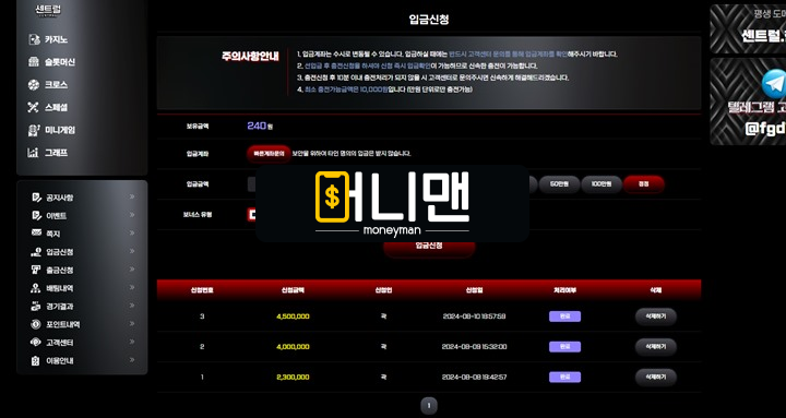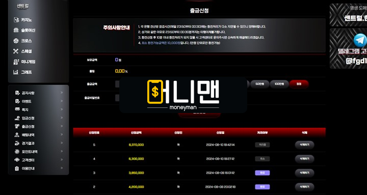 안녕하세요. 센트럴에서 637만원 원금까지 싹 먹튀 당했습니다. 450만원 충전해서 슬롯으로 630만원 만들어서 환전 신청했더니 롤링이 부족하다고 해서 게임 몇 번 더 돌려주고 637만원 만든 다음에 다시 환전 누르고 기다렸는데 5분이 지나도 입금이 안 되어있어서 다시 접속해 보니까 아이디 차단되어 있네요. 텔레그램으로 무슨 일인지 문의해 보려 했더니 텔레그램마저도 차단당해 있었습니다. 거렁뱅이들이 이유도 없이 무지성으로 돈 다 먹고 차단해 버리네요. 다른 피해자분들 글 보면 양방 회원으로 몰렸던가 규정 위반이라던가 다양한 이유라도 있었는데 저는 이유마저 알려주지도 않고 그냥 냅다 먹고, 차단이라니 진짜 이런 토할 거같이 역겨운 사이트는 처음 봅니다. 저는 원래 슬롯을 주로 하던 유저였고 놀 때도 보통 몇백 단위로 노는 사람이라 사이트 입장에서도 좋아할 텐데 사용한 지 2주 만에 먹고 잘라 버리네요. 사이트 주인이 머리가 멍청해서 돈 벌 줄 모르는 건지 아니면 매우 가난한 거렁뱅이 사이트인 건지 잘 모르겠습니다. 원래 알고 지내던 총판이 새로 오픈한 놀이터니까 잘 챙겨 줄 거라면서 소개해 주길래 믿고 이용해 봤는데 결국 당해버렸네요. 역시 총판 놈들도 믿을게 못됩니다. 이런 치졸한 사이트에서 더 이상 피해자가 나오지 않았으면 해서 신고해요. 혹시라도 이용 중이신 분들은 당장 이용 중지하시길 바랍니다.