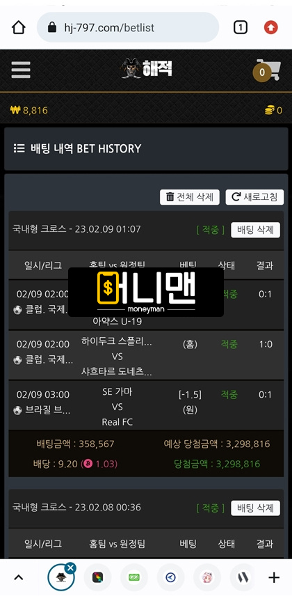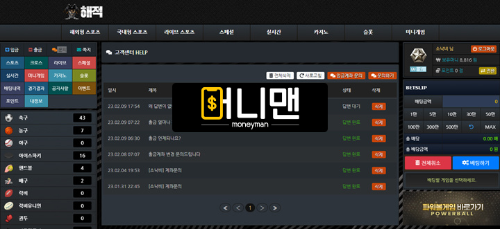 해적이라는 사이트는 1월 말에 가입하고 대략 10일 정도 이용하고 있었는데 2월 9일 새벽 스포츠 경기 3개 묶어서 배팅 진행하고 전부 다 적중이 되어서 329만원 있는거 환전신청 넣었더니 해외 쪽 서버장애로 환전이 지연된다고 쪽지가 날아오더라구요 그래서 그런가 보다 하고 기다리고 있었는데 정상화가 너무 되지 않아서 다시 고객센터에 문의를 남겨보니 이번에는 답변도 1시간이 넘게 안 오는겁니다. 그래서 처리 중인가 보다 하고 조금 쉬다가 다시 사이트에 접속 해보려고 로그인 하니 제 정보가 없다네요 하 이런 식으로 먹튀를 당한 건 처음이라 너무 어이가 없어서 사이트 쪽이랑 대화도 일절 안 되고 답답한 마음에 다른 분들은 피해보지 마시라고 이렇게 제보 하게 되었습니다. 해적 이용하시는 분들은 즉시 이용 중단하세요!