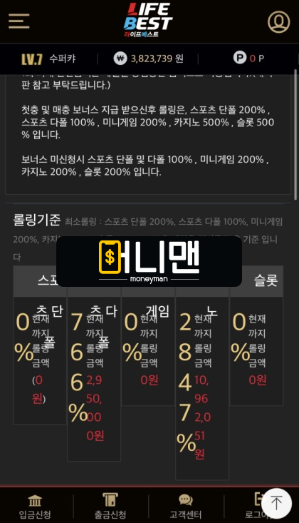 여러분 라이프베스트 여기 잃고 있는 회원 당첨금도 자기들 입맛대로 감아버리는 먹튀 업체입니다. 실제로 배팅했던 기간만 3년이 넘어갈 정도로 오래 이용해 왔던 놀이터고요. 그동안 최소 1억 가까이 지고 있었습니다. 이렇게 지고 있는 회원 돈을 건들 정도로 양아치들은 아닌 거 같아서 잃더라도 꾸준하게 돈을 충전하며 배팅을 이어왔는데요. 믿는 도끼에 발등이 찍히는 사건이 일어납니다. 소액 넣어서 스포츠배팅과 카지노를 연달아 당첨시켜 380만원을 만들었고 출금 신청을 눌렀는데요. 환전이 지연될 거라는 말만 반복하며 시간을 끕니다. 정상화되면 알아서 연락한다길래 믿고 기다렸는데요. 열흘이라는 시간 동안 연락이 없었습니다. 분명 모든 유저가 동일하게 환전이 지연된다고 그랬는데 게시판을 확인해 보니까 다른 분들은 이상 없이 배팅하고 있더라고요. 이벤트까지 올라오며 사이트가 정상 운영되고 있었습니다. 그제야 저는 뭔가 잘못된 걸 느꼈고 다시 재문의를 해봤는데요. 곧바로 제 계정을 정지시킵니다. 아무리 소액으로 380만원까지 금액을 올렸다고 한들 1억 가까이 잃었던 회원한테 먹튀 치는 건 정말 아니죠. 라베 이용하시는 분들 제 글 꼭 읽어보세요. 진짜 사람 당하는 거 한순간입니다.