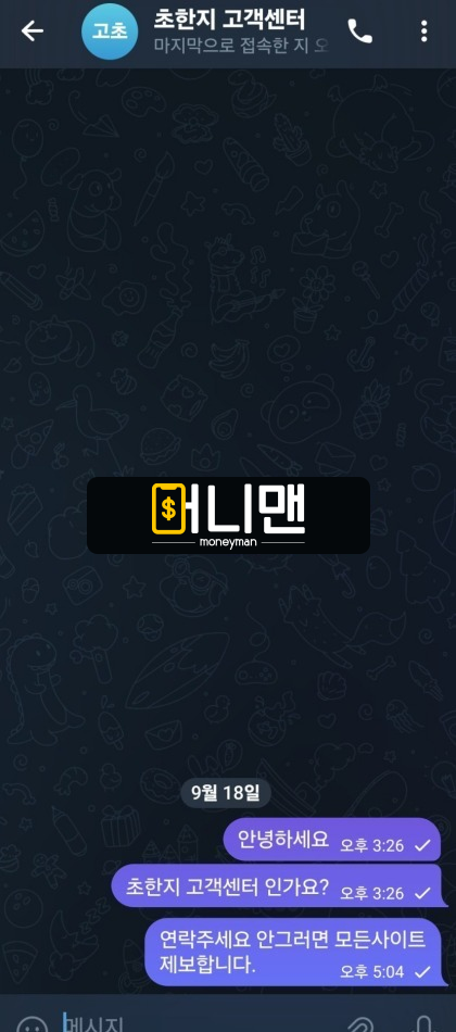 제가 초한지에서 먹튀 당한 실제 사건 글로 남기고 갑니다. 이 사이트를 이용하게 된 계기는 어떤 팀장이라는 사람 권유로 가입하게 되었는데요. 이벤트와 혜택이 전부 무난한 사이트였습니다. 그렇기 때문에 저는 아무런 걱정도 없이 스포츠배팅 4폴더를 걸었는데요. 배팅한 경기가 모두 적중하면서 101만원이라는 당첨금을 만들고 환전 신청을 했습니다. 하지만 환전은 안 나오고 대신 긴급 계좌 변경이라는 안내 쪽지가 왔는데요. 여기에서부터 이상한 점이 있었습니다. 원래 이런 긴급 상황은 사이트에서 대부분 공지로 알려주는데 저에게 달랑 쪽지 하나만 왔다는 점인데요. 의심은 조금 되었지만, 다시 환전 신청을 하면 바로 환전해 준다는 소리에 안심하고 계좌 변경이 끝나기를 기다렸습니다. 하지만 제 촉이 맞았는지 잠시 뒤 문제가 발생하고 말았는데요. 제 사이트 아이디가 탈퇴 처리되었고, 고객센터에서는 어떠한 연락도 없었습니다. 그래서 텔레그램 고객센터에 급하게 연락을 보내 봤지만, 의미 없는 짓이었더라고요. 제 문의에 답변도 없을뿐더러 읽지도 않습니다. 첫 환전 신청이었고 금액도 고액이 아니었기 때문에 먹튀 당할 거라고 예상을 못 했는데요. 이 글을 쓰면서 초한지 여기가 얼마나 구멍가게인지 다시 한번 느끼게 되는 거 같습니다.