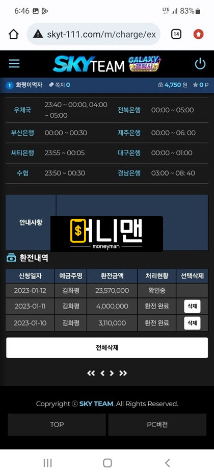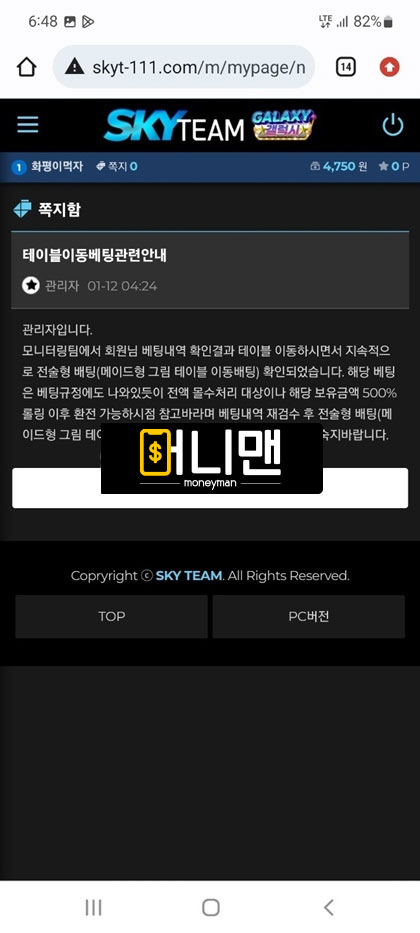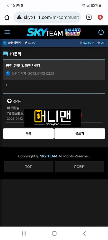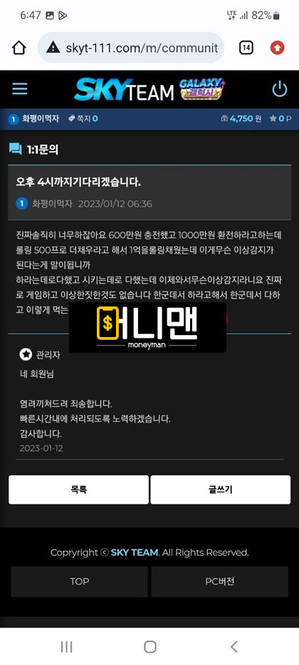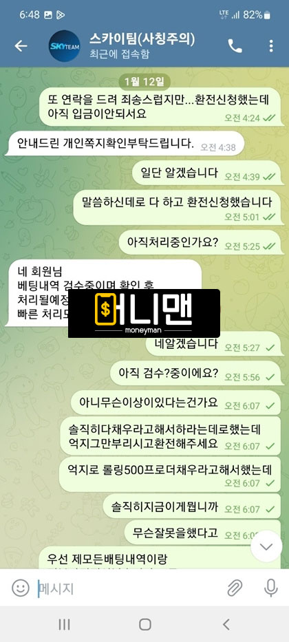 며칠 전에 스카이팀에서 200만원 씩 총 3번 충전해서 1000만원까지 만들었습니다.(2번 뿌러지고 3번 째에 수익남) 그리고 환전 신청 넣었는데 무슨 모니터링팀에서 배팅 내역이 이상한 징후가 포착 되었다면서 에볼루션 게임사 본사 측에 검수 요청이 들어가고 정상적으로 확인이 된다면 환전을 넣어준다고 말을 하더라구요. 그래서 기다리고 있다가 결과를 들었는데 제가 무슨 전술형 배팅을 한 것으로 확인이 되어서 전액 몰수 처리를 하던지 아니면 보유 금액에 500% 추가적으로 롤링을 돌리라고 하더라구요 그러면 총 5000만원을 롤링을 쳐야한다는건데 뭐 어쩔 수 있나요 돈 받으려면 해야지 그래가지고 롤링 다 채우고 보유금액 2375만원까지 되어서 다시 기분 좋은 마음으로 환전을 넣었습니다. 근데 또 검수를 한다네요 ㅁㅊ놈들이? 그래가지고 일단 기다렸는데 악의적인 줄 배팅으로 또 전액 몰수 처리 한다고 ㅈㄹ을 하는겁니다. 어이가 없어서 따지고 있는 상황에서 원금 600만원이라도 돌려달라 하니까 400만원 밖에 안 된다고 그래서 계속 따지다가 결국 아이치 차단당하고 원금까지 전부 먹튀 당했습니다. 개 ㅈ같이 운영하는 스카이팀 즉시 이용 중단들 하세요.