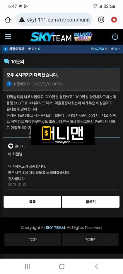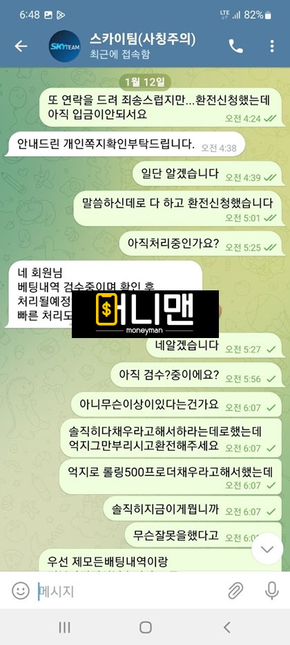 며칠 전에 스카이팀에서 200만원 씩 총 3번 충전해서 1000만원까지 만들었습니다.(2번 뿌러지고 3번 째에 수익남) 그리고 환전 신청 넣었는데 무슨 모니터링팀에서 배팅 내역이 이상한 징후가 포착 되었다면서 에볼루션 게임사 본사 측에 검수 요청이 들어가고 정상적으로 확인이 된다면 환전을 넣어준다고 말을 하더라구요. 그래서 기다리고 있다가 결과를 들었는데 제가 무슨 전술형 배팅을 한 것으로 확인이 되어서 전액 몰수 처리를 하던지 아니면 보유 금액에 500% 추가적으로 롤링을 돌리라고 하더라구요 그러면 총 5000만원을 롤링을 쳐야한다는건데 뭐 어쩔 수 있나요 돈 받으려면 해야지 그래가지고 롤링 다 채우고 보유금액 2375만원까지 되어서 다시 기분 좋은 마음으로 환전을 넣었습니다. 근데 또 검수를 한다네요 ㅁㅊ놈들이? 그래가지고 일단 기다렸는데 악의적인 줄 배팅으로 또 전액 몰수 처리 한다고 ㅈㄹ을 하는겁니다. 어이가 없어서 따지고 있는 상황에서 원금 600만원이라도 돌려달라 하니까 400만원 밖에 안 된다고 그래서 계속 따지다가 결국 아이치 차단당하고 원금까지 전부 먹튀 당했습니다. 개 ㅈ같이 운영하는 스카이팀 즉시 이용 중단들 하세요.